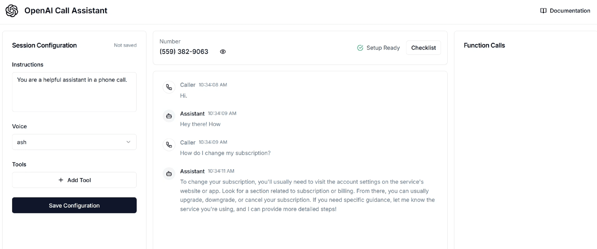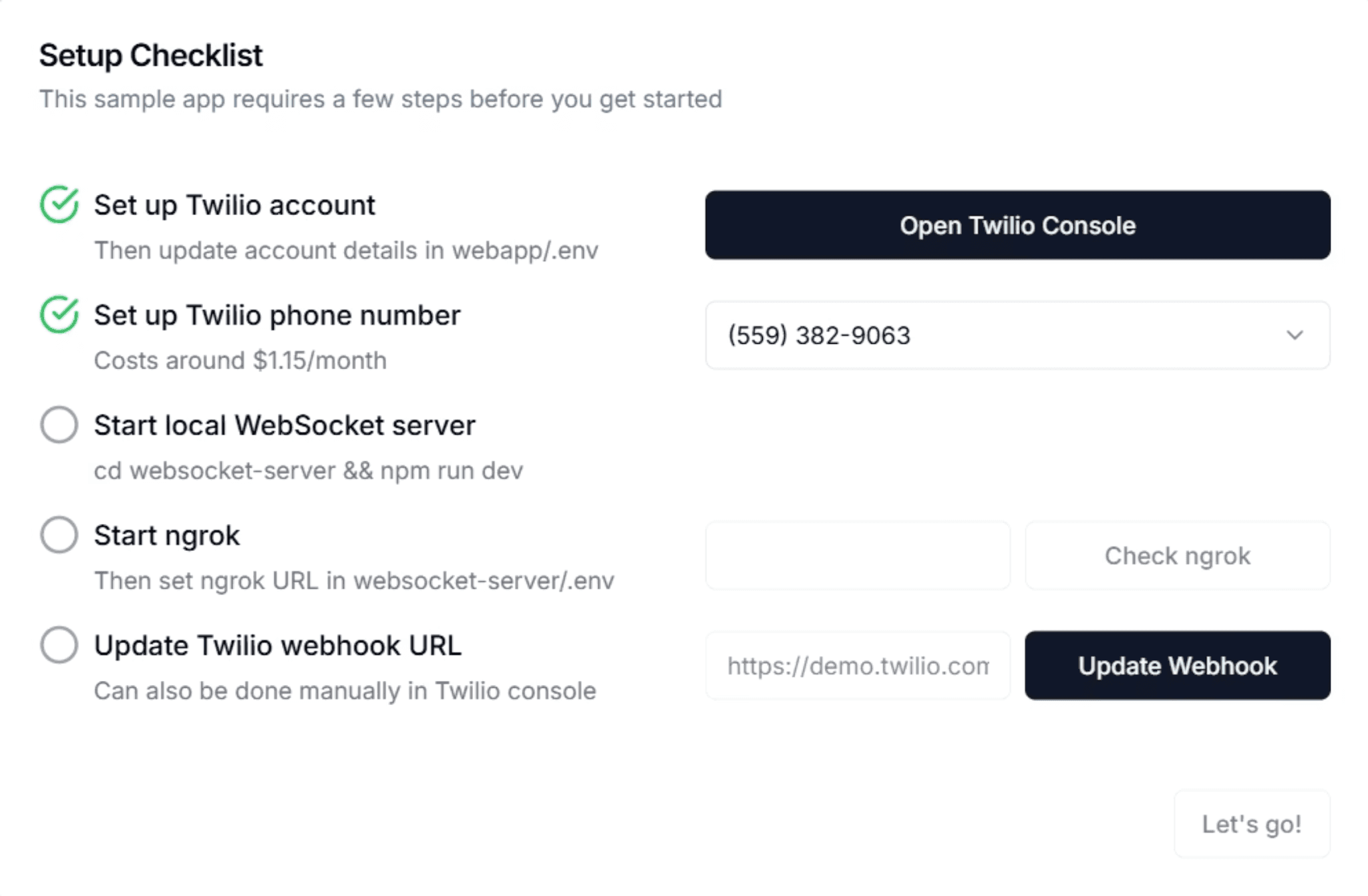 Use Ngrok again to expose your local WebSocket server, then follow the setup checklist in the demo application. Once configured, you’ll have a phone number that customers can call to interact with your AI agent using natural voice conversation.