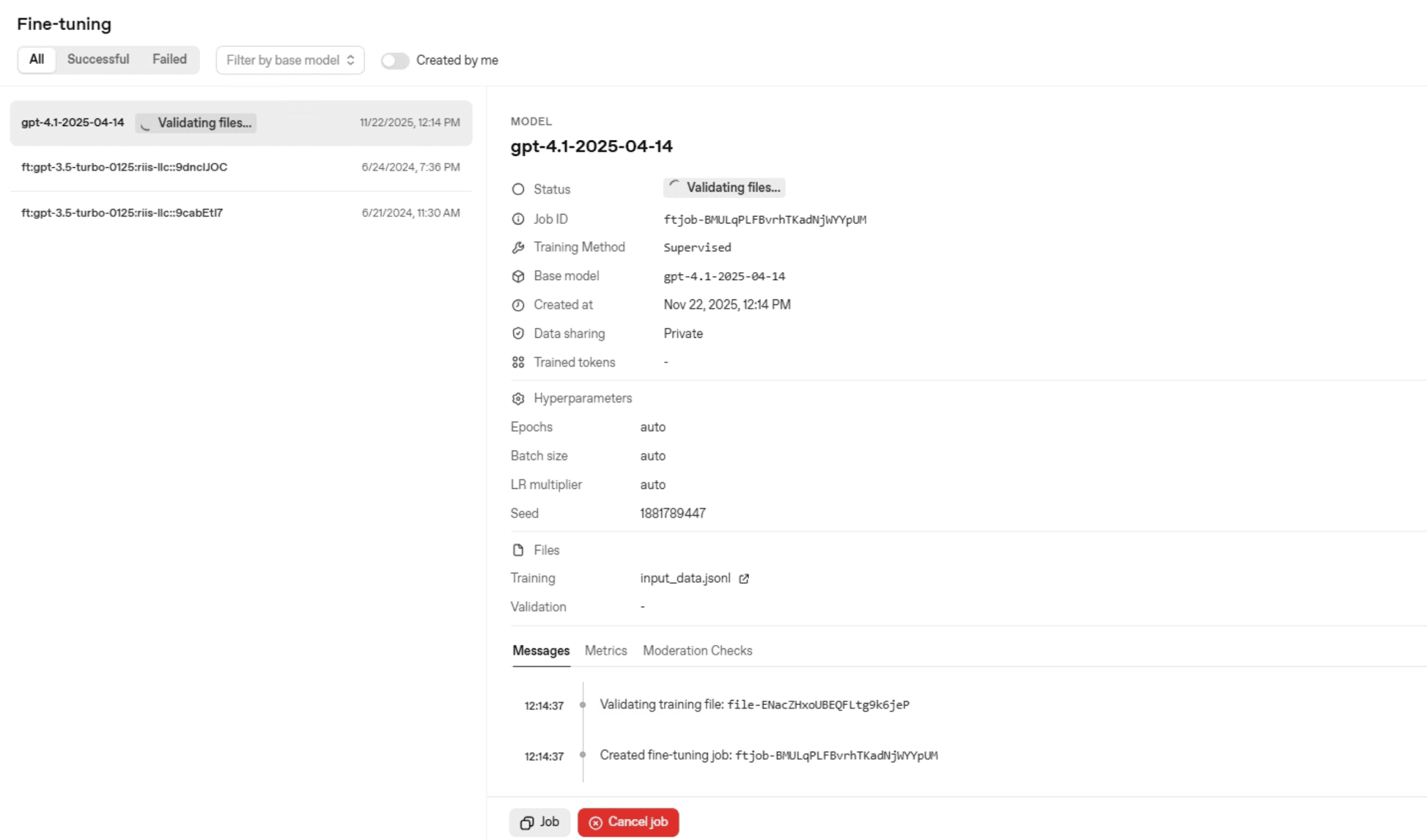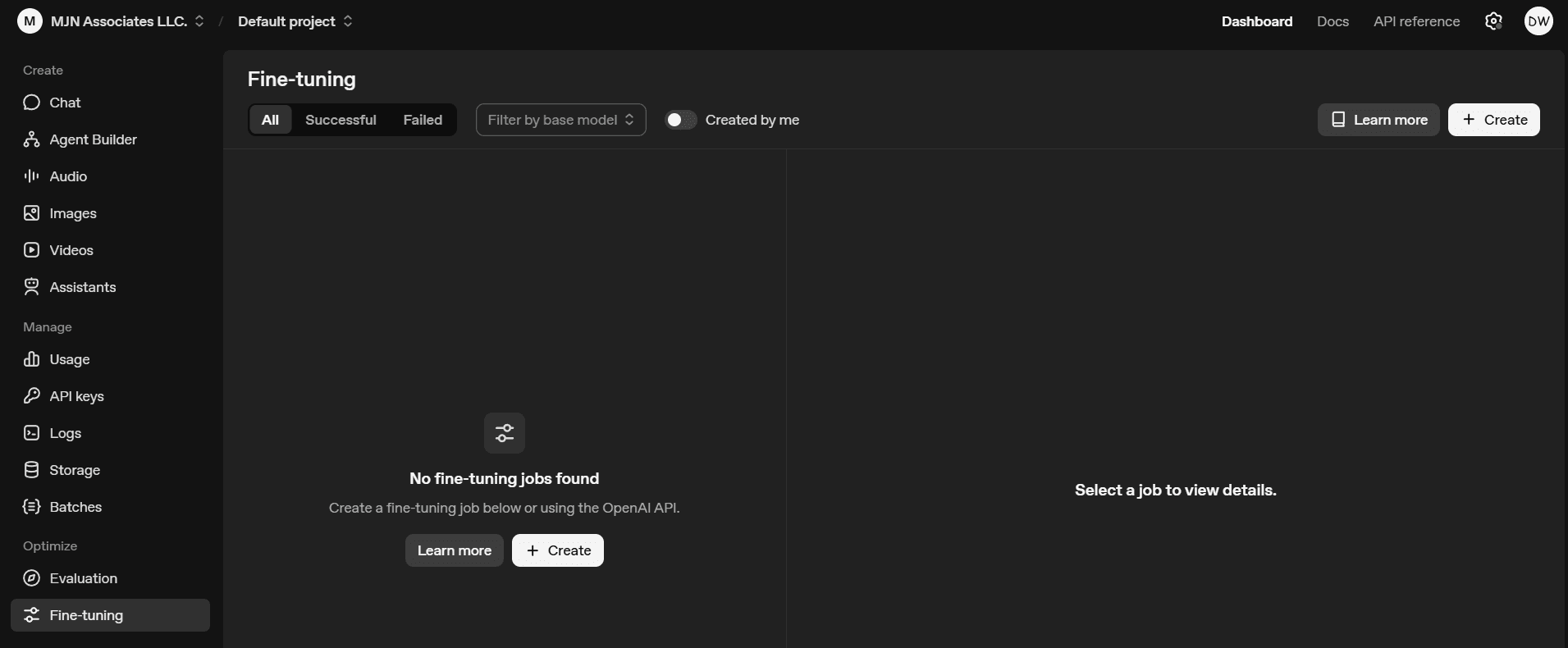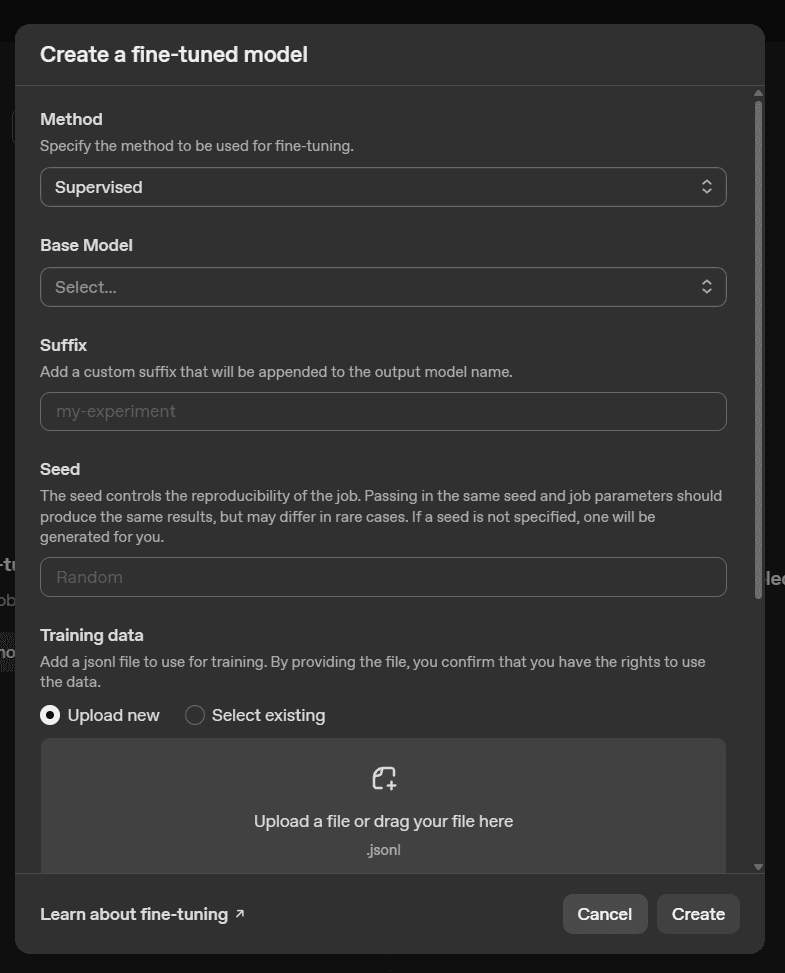Navigate to the OpenAI Playground, click on Fine Tuning, and upload your JSONL file. Currently, fine-tuning works with GPT-4 models.