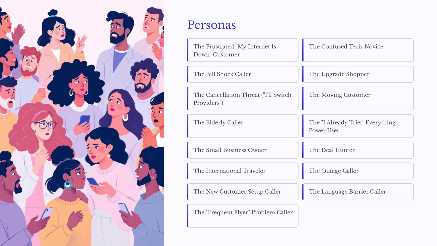 The generated personas span a wide range of customer types including the frustrated “my internet is down” customer, the international traveler needing roaming information, elderly callers who need extra patience, small business owners with complex account needs, and customers threatening to cancel service. We also leveraged ChatGPT to create conversation scripts for each persona, which we use for fine-tuning our technical support model.