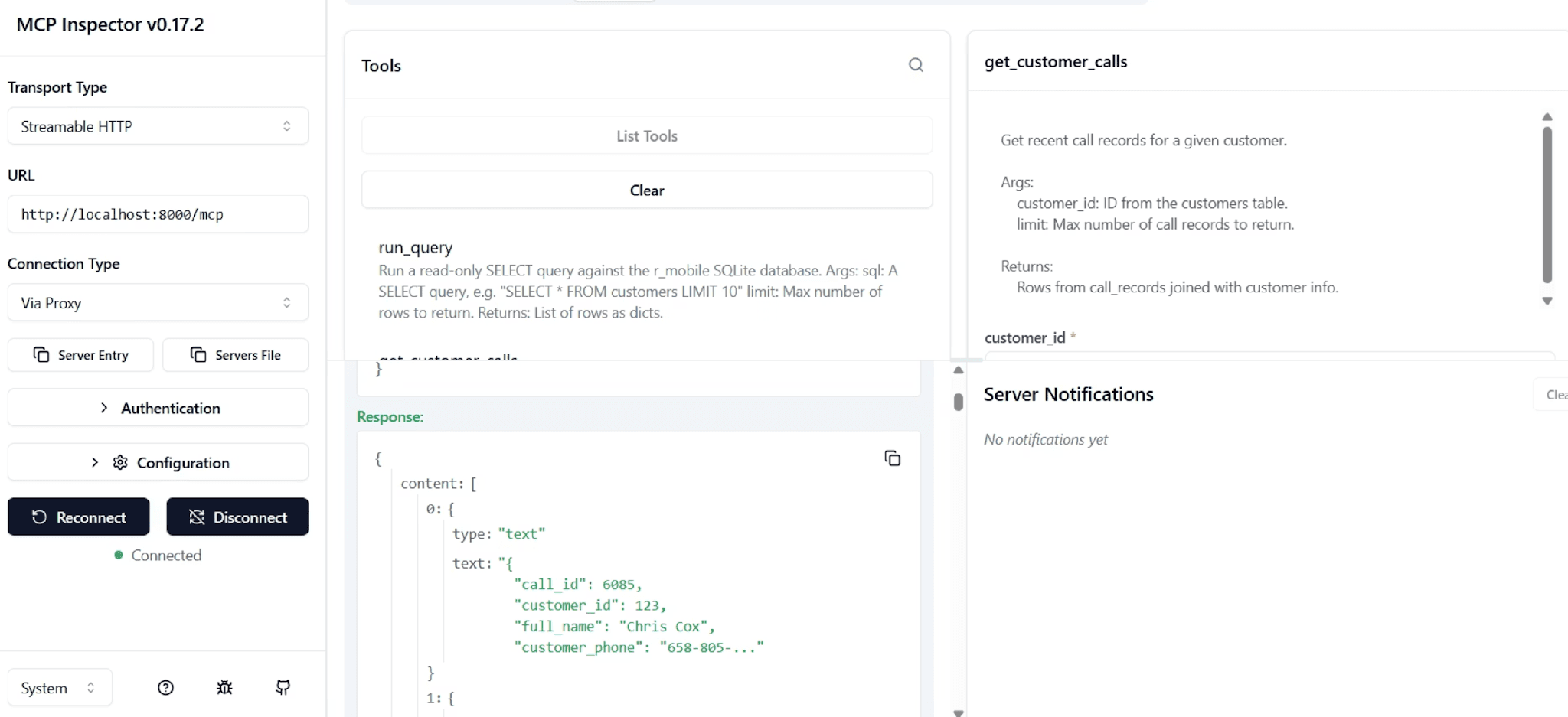 The inspector lets you connect to your MCP server, view available tools, and test queries like “get customer calls” to ensure everything communicates properly.
