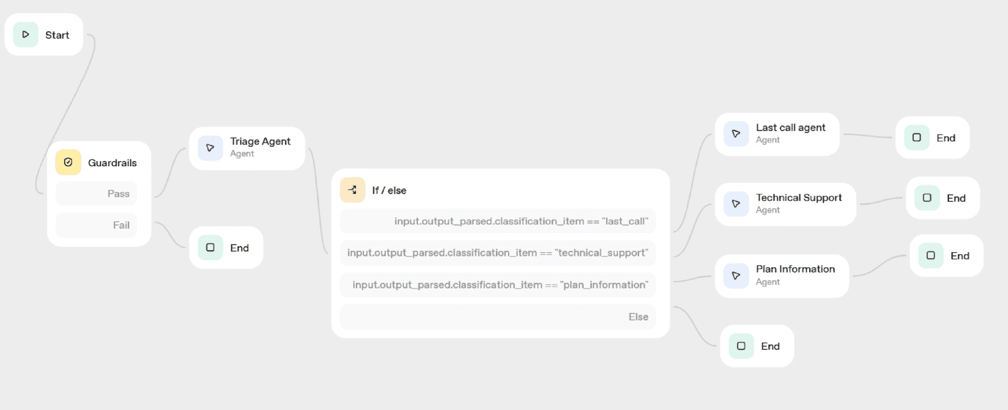 This modular approach ensures that each type of customer inquiry gets routed to the most appropriate resource, mimicking how a real call center would escalate different issues to specialized departments.