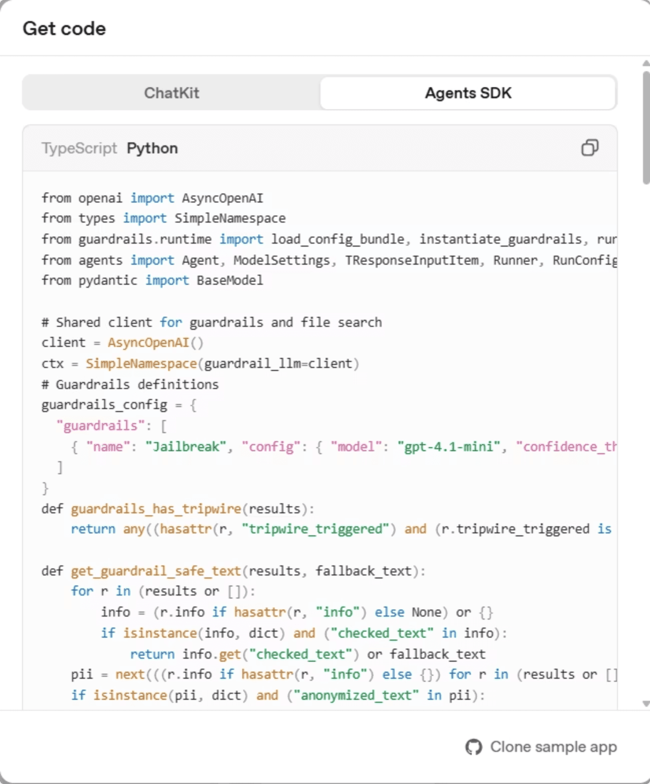 If you want to run the agent locally, export the code by clicking Code in the top right, selecting Agents SDK, and choosing Python.