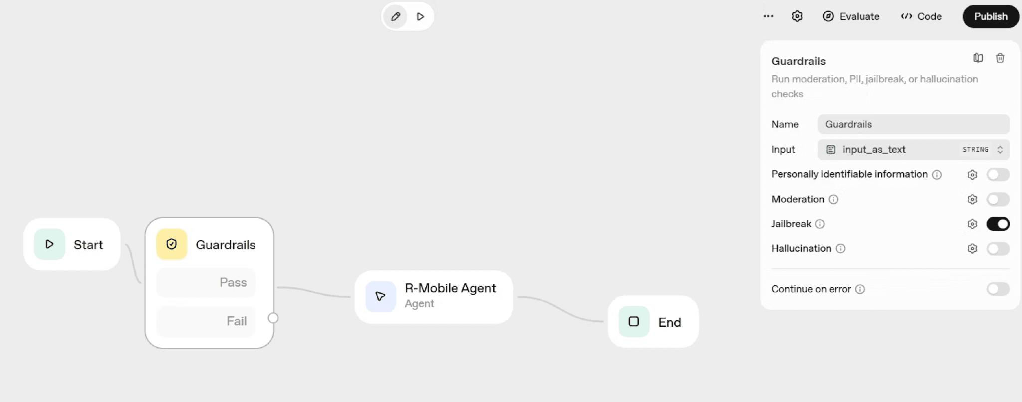 To protect your agent from malicious inputs, drag a guardrail node onto the canvas and connect it before your main agent. Enable the jailbreak protection option to prevent users from manipulating your agent into ignoring its instructions or revealing sensitive information.