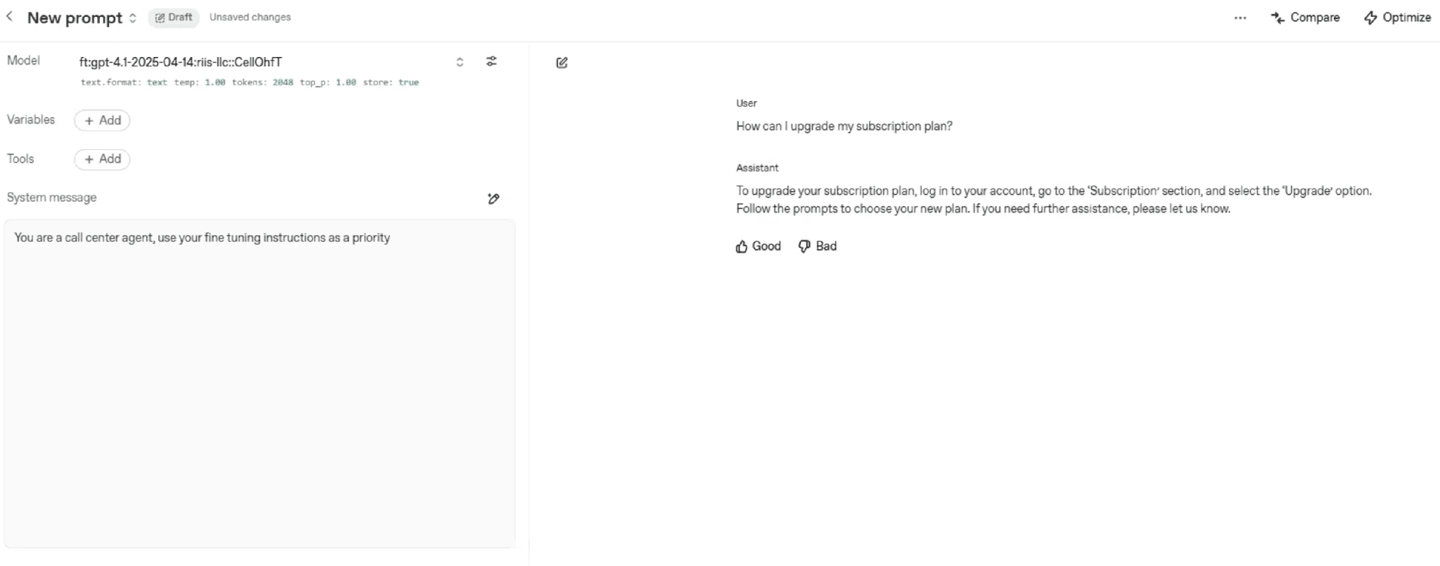 Connect your agent to the fine-tuned model you created earlier. This configuration ensures that when customers ask technical support questions, the agent draws from your carefully curated knowledge base rather than generic internet information.