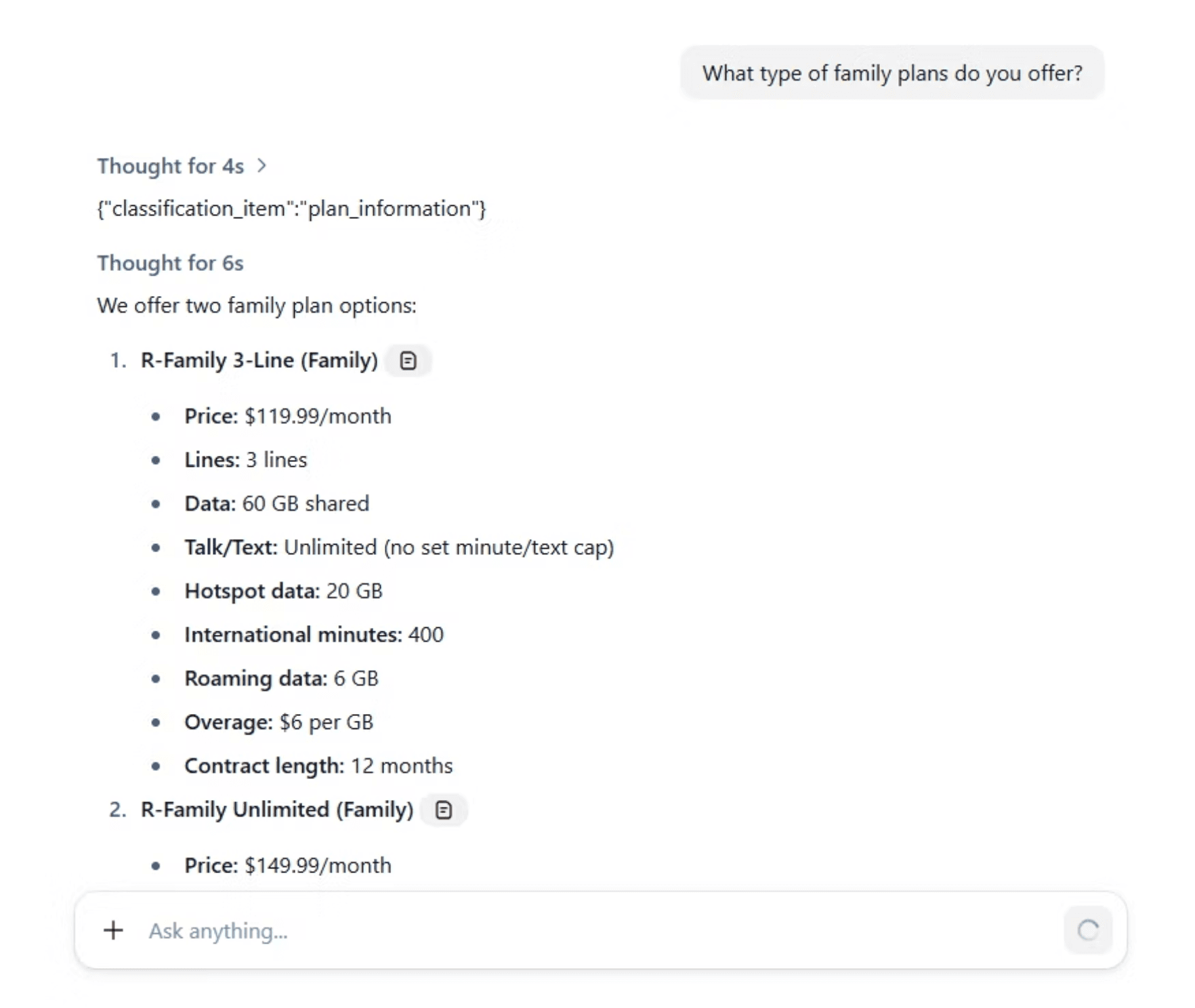 The chatbot interface lets you test conversational interactions like asking about family plans and seeing formatted responses in a familiar chat window.