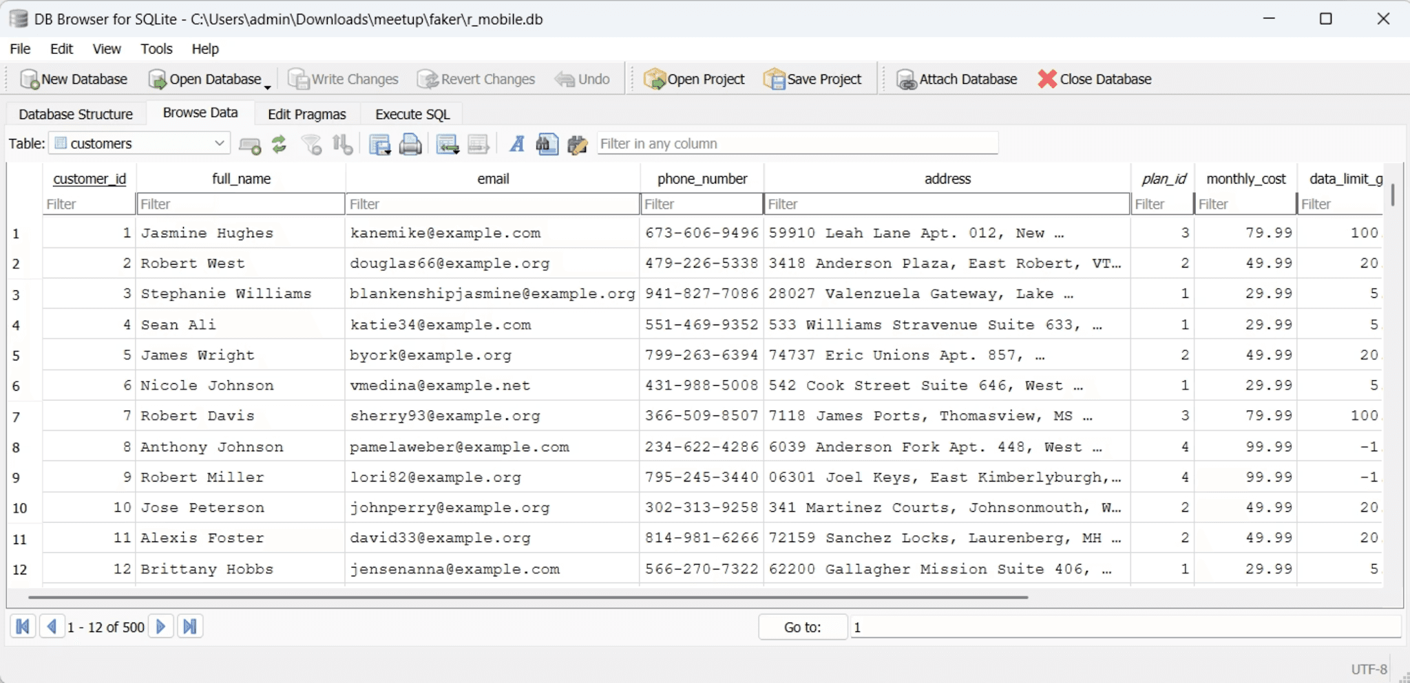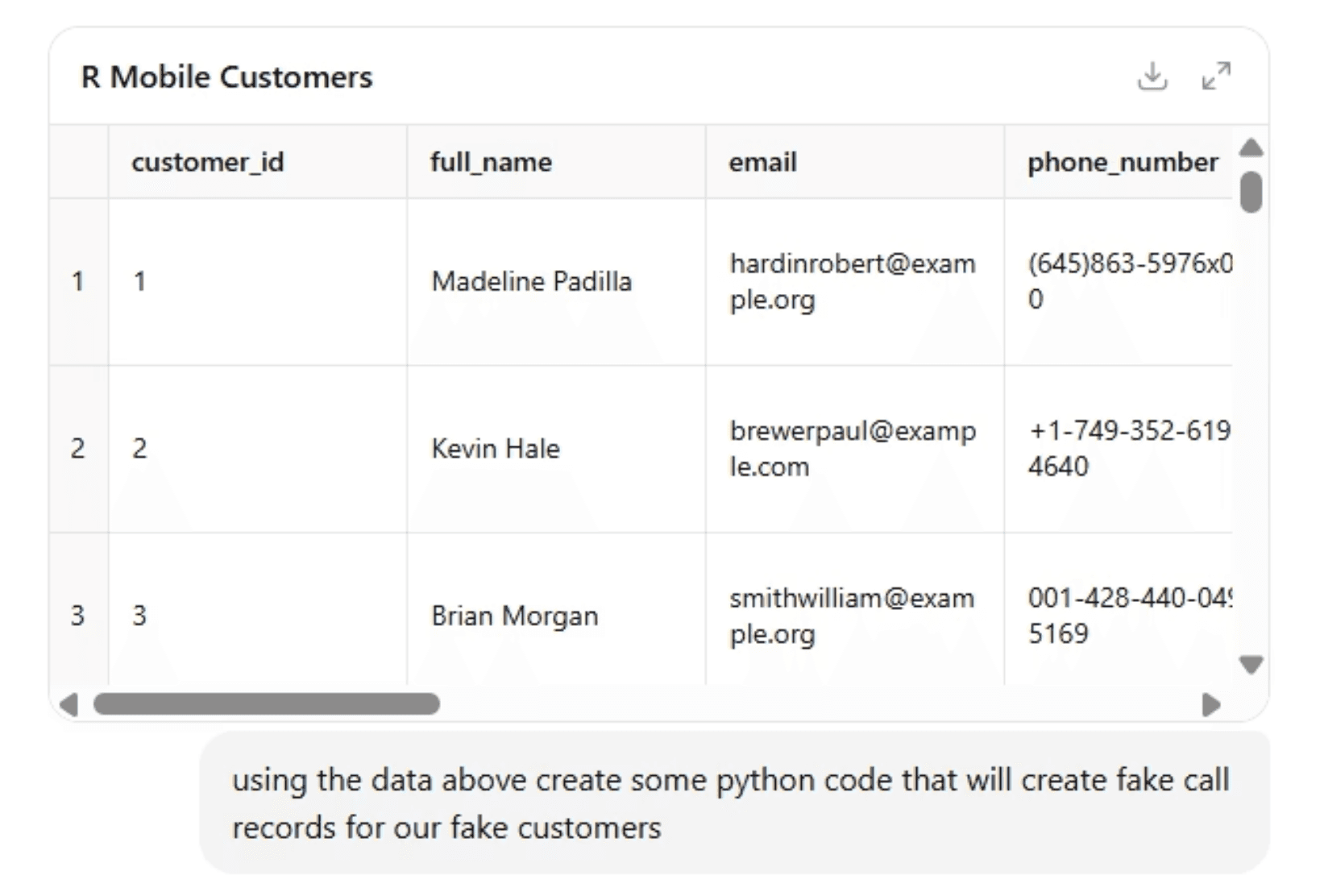 If you don’t have data to start with, we’ll have to generate some. First, generate synthetic customer data using Python’s Faker library. The provided repository includes scripts in the faker folder that create realistic customer records with phone plans, usage statistics, and call histories stored in CSV files.