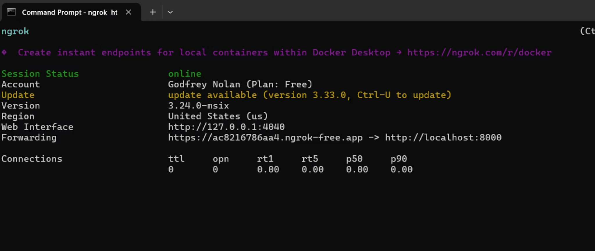 Ngrok provides a forwarding URL that you’ll use when configuring the MCP connection in Agent Builder.