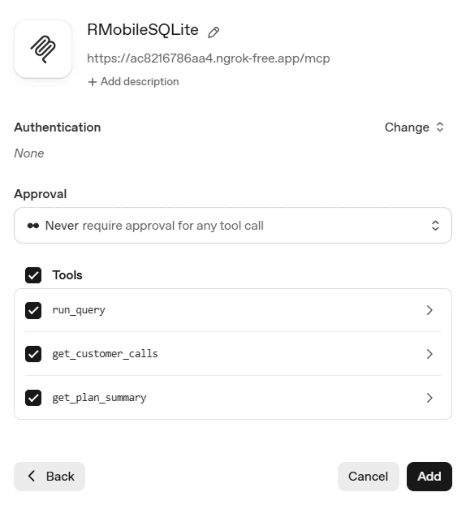 After connecting, you’ll see the list of available tools auto-generated from your MCP server code. Set the approval mode to “never require approval” so the agent can query the database without manual intervention for each request.