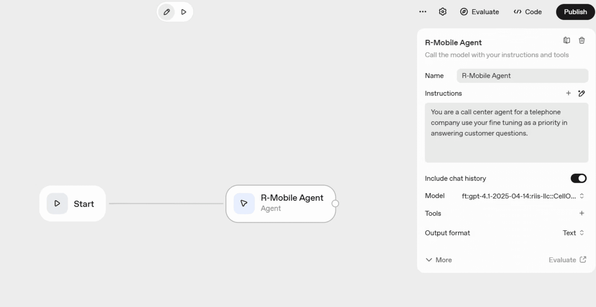 Open the Agent Builder in the OpenAI Playground and begin constructing your workflow. Drag a start node and an agent node onto the design canvas. Name your agent “R-Mobile Agent” and provide instructions such as: “You are a call center agent for a telephone company. Use your fine tuning as a priority in answering customer questions.”