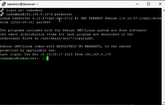 Connect to your Raspberry Pi using PuTTY with the static IP address you configured. Accept the SSH key when prompted and log in with your takadmin credentials.