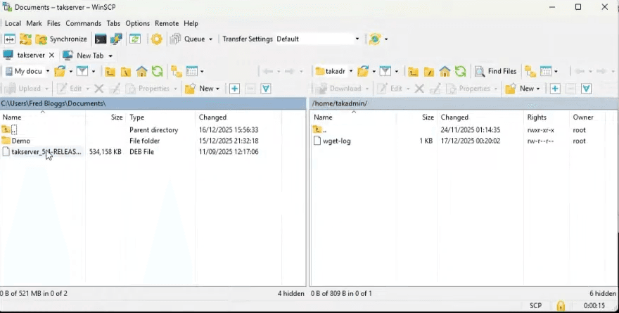The interface displays your local Windows files on one side and your Raspberry Pi home directory on the other. Upload the TAK Server Debian package (takserver_5.4-RELEASE101_all.deb) to your takadmin home directory.