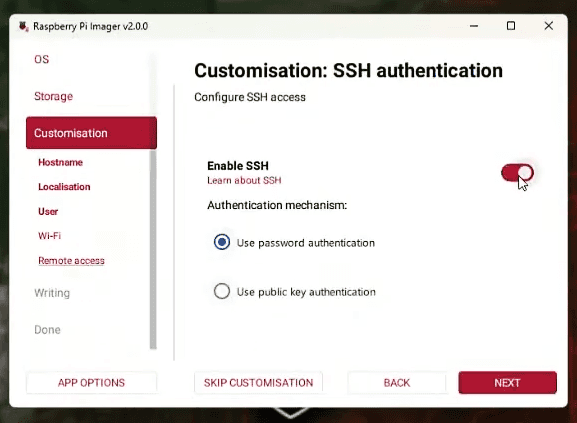 Skip the Wi-Fi configuration since you’ll connect the Pi directly to your router via Ethernet. Most importantly, enable SSH access with password authentication under the remote access settings. This allows you to connect to your server remotely once it boots.