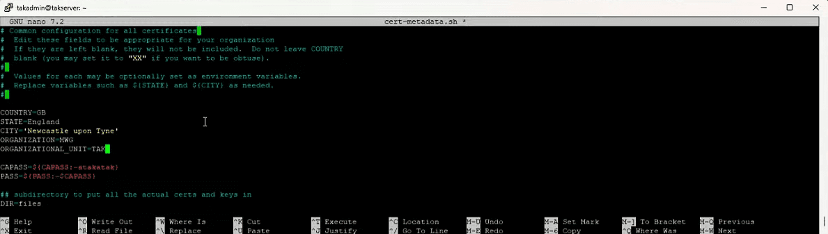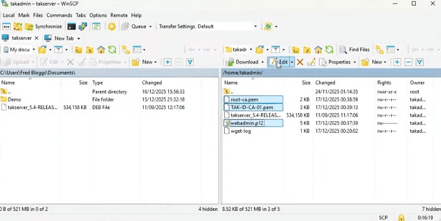 In total it’s our webadmin.p12, root-ca.pem and root-ca.crt , and our id key and cert, TAK-CA-01.pem and TAK-ID-CA.crt. The last command sudo chown -R takadmin: /home/takadmin consolidates ownership of all the files under the takadmin .