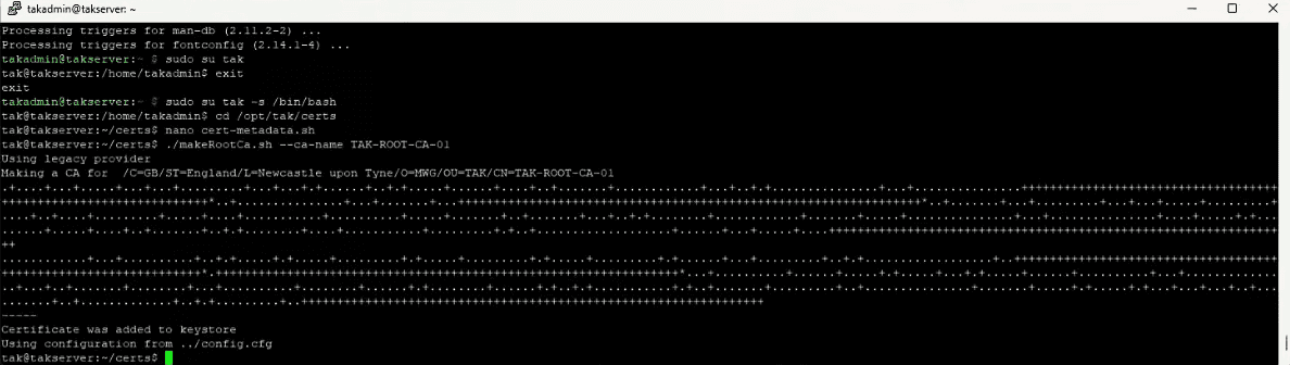 TAK Server uses a hierarchical certificate structure for secure communications. Switch to the TAK user account and navigate to the certificate directory: