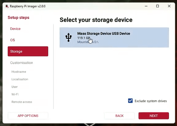 Click on [ NEXT ] and then select Mass Storage Device USB Device. Hit [ Next ] again and enter a hostname such as “takserver” without including a domain extension. Set your timezone to UTC for consistency across deployments, configure your keyboard layout, and create a username. Following TAK conventions, use “takadmin” as your administrative user with a secure password that you document safely.