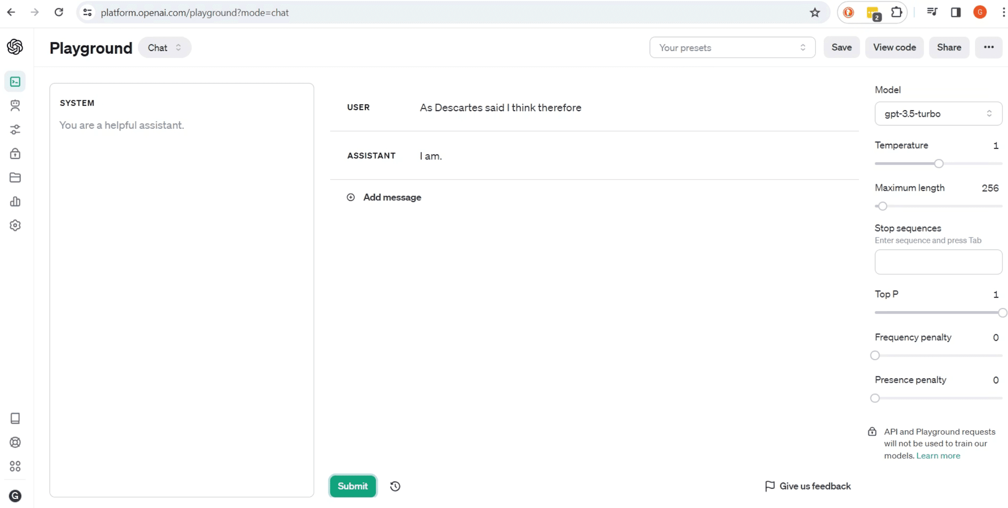 Despite what you may have heard in the news, if you run the code today, it will still ping 3.5 and as expected it should return the phrase “I am,” completing Descartes’ famous statement.