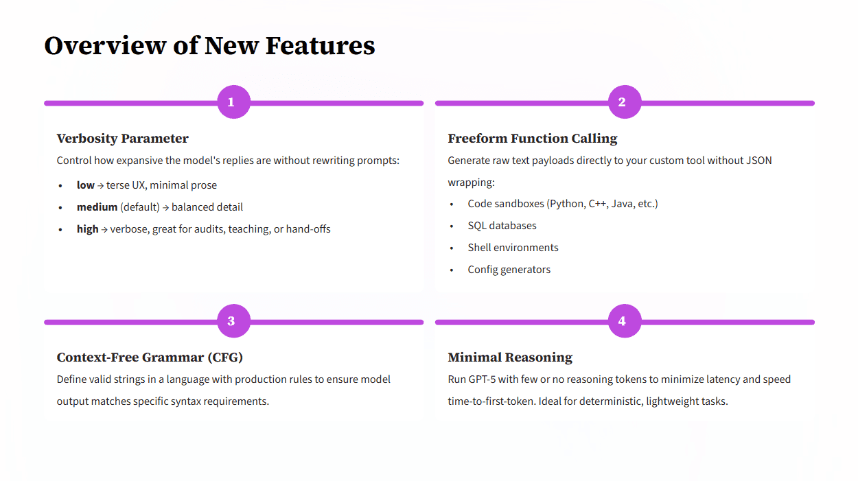 One of GPT-5’s most innovative features is freeform function calling, which allows the model to generate and execute arbitrary code, queries, and configurations. This capability transcends traditional API limitations by enabling direct text payload generation to custom tools.