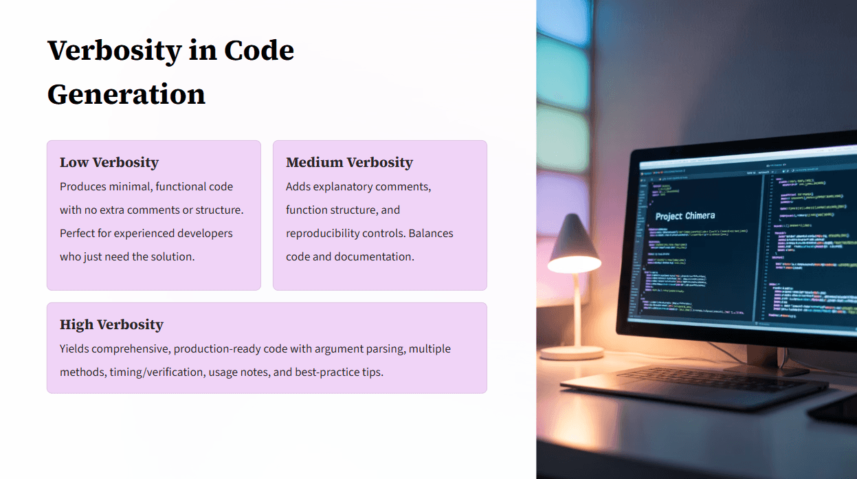 This parameter proves particularly valuable in code generation scenarios. Low verbosity produces minimal, functional code with no extraneous comments—perfect for experienced developers who understand the context. Medium verbosity adds helpful comments and basic documentation, while high verbosity generates production-ready code with comprehensive comments, error handling, and best practice recommendations.