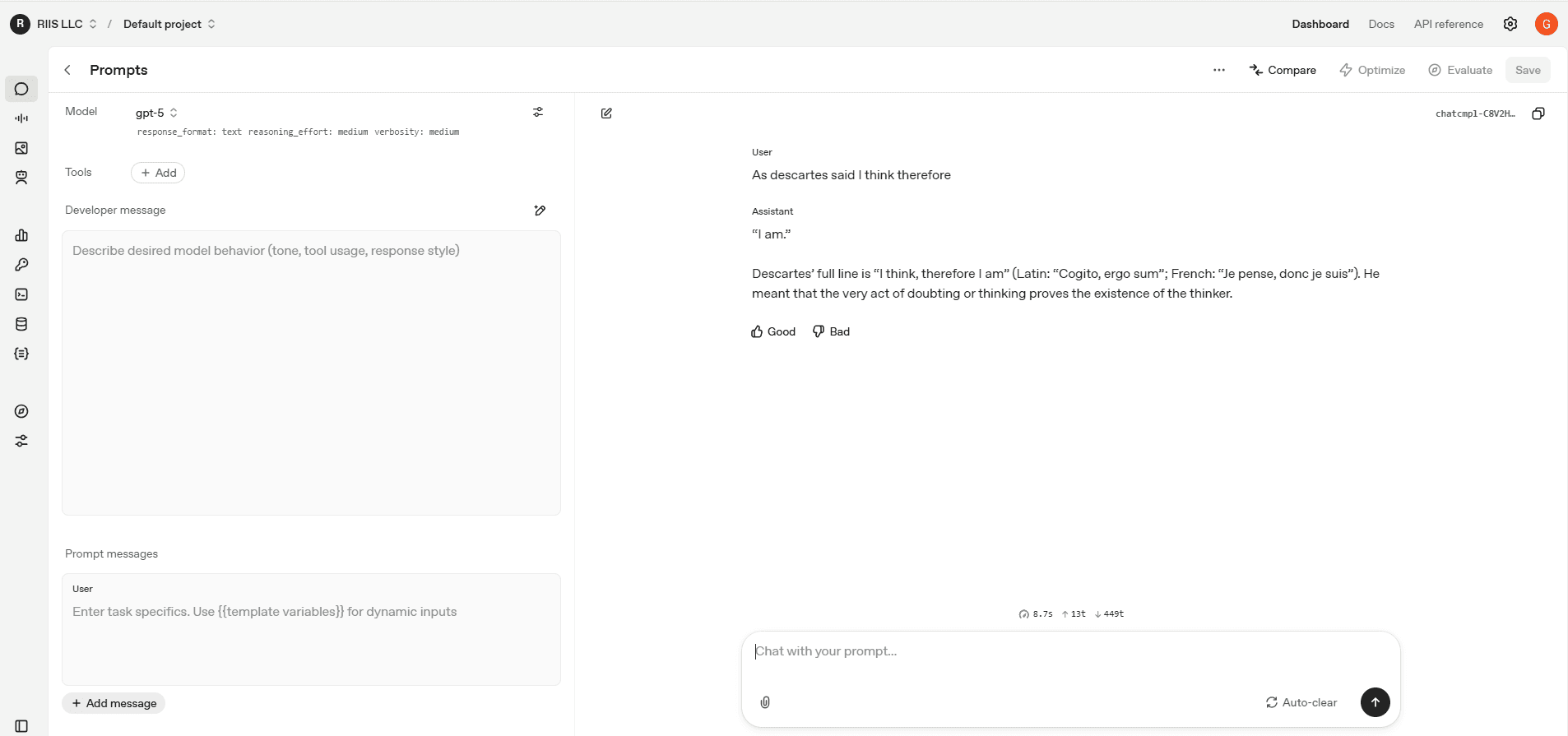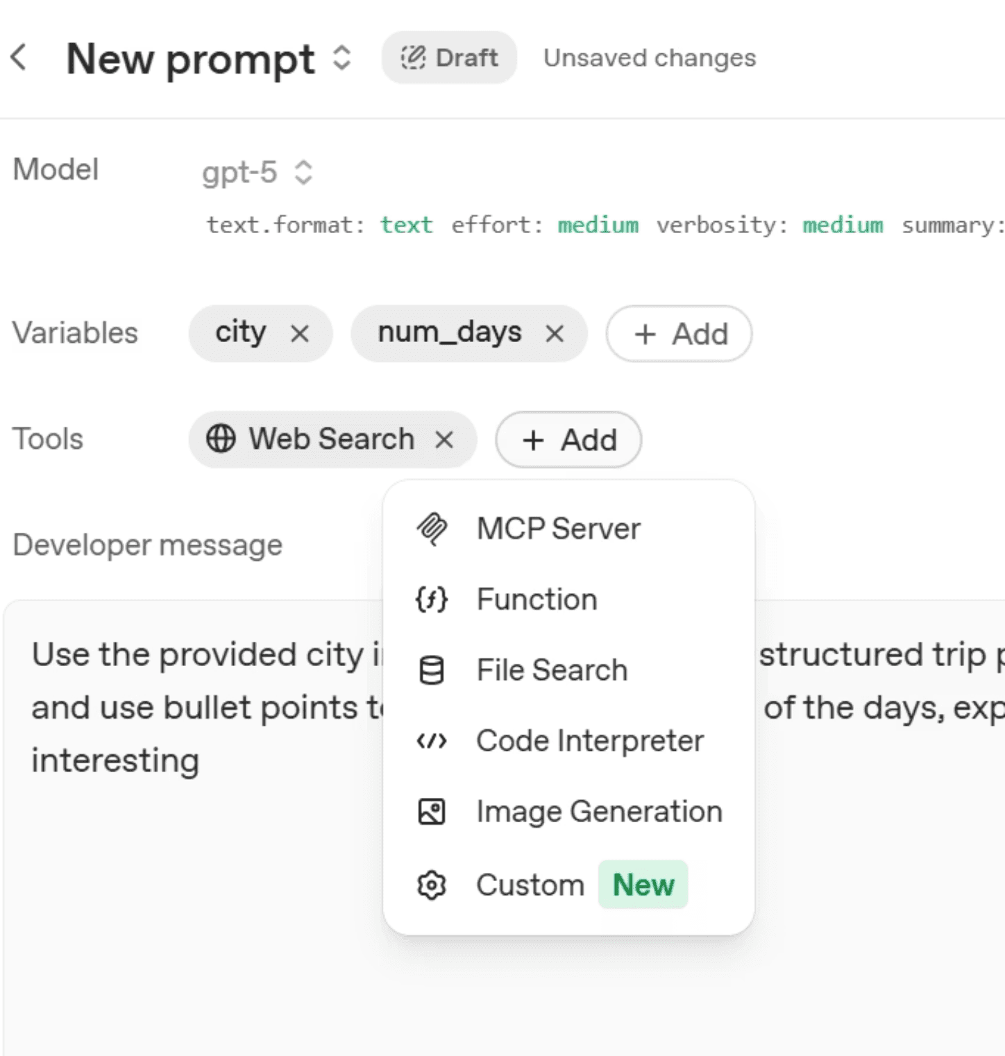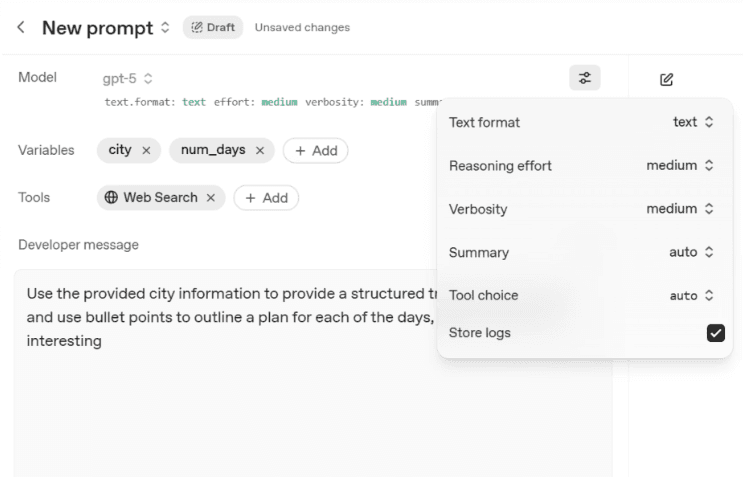 Now in GPT 5, the layout has shifted significantly. Model parameters now rest on the left side, System has been replaced with Developer message (they are mostly the same, so don’t worry), and additional Tools can be added with a simple button click or two. They include things like web search, create image, or connect to an MCP.