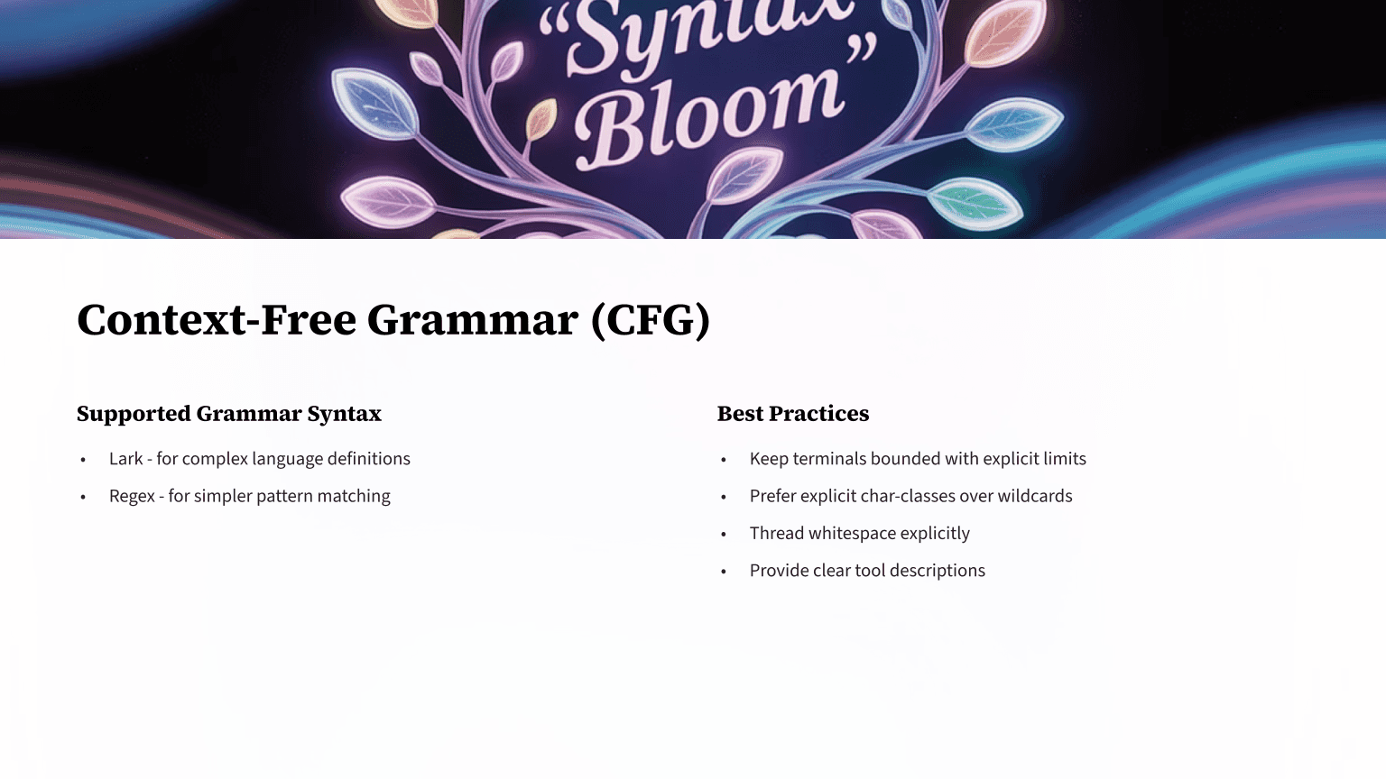 The integration of Context-Free Grammar (CFG) support represents a sophisticated approach to ensuring output format compliance. CFG has deep roots in compiler design and formal language theory, making it an ideal tool for constraining AI output to specific structural requirements.