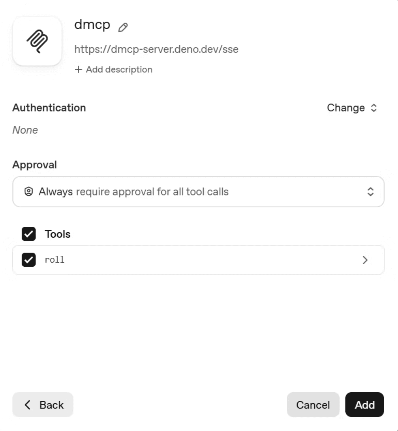 We’re going to connect to a Dungeons & Dragons server for some fun. Add an MCP Server with the (+ Add) tool button then click on the [+ Server] button in the top right. Enter ‘https://dmcp-server.deno.dev/sse’ as the URL, ‘dmcp’ as your Label, and ‘A Dungeons and Dragons MCP server to assist with dice rolling’ as your Description.