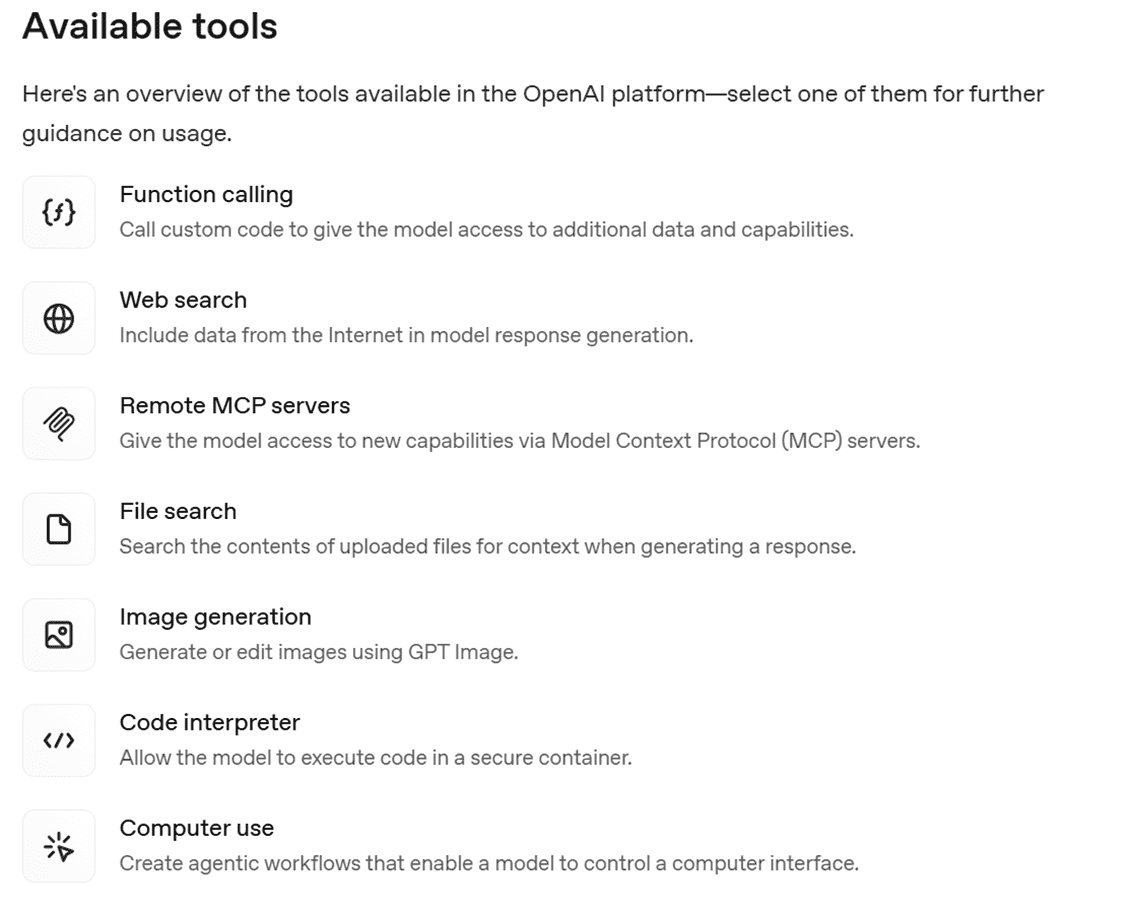 Okay, now we are going look at the ‘Custom’ option like we promised. GPT-5’s custom tool system enables sophisticated integrations that were previously impossible or extremely complex to implement. These tools fall into several categories, each serving different development needs.