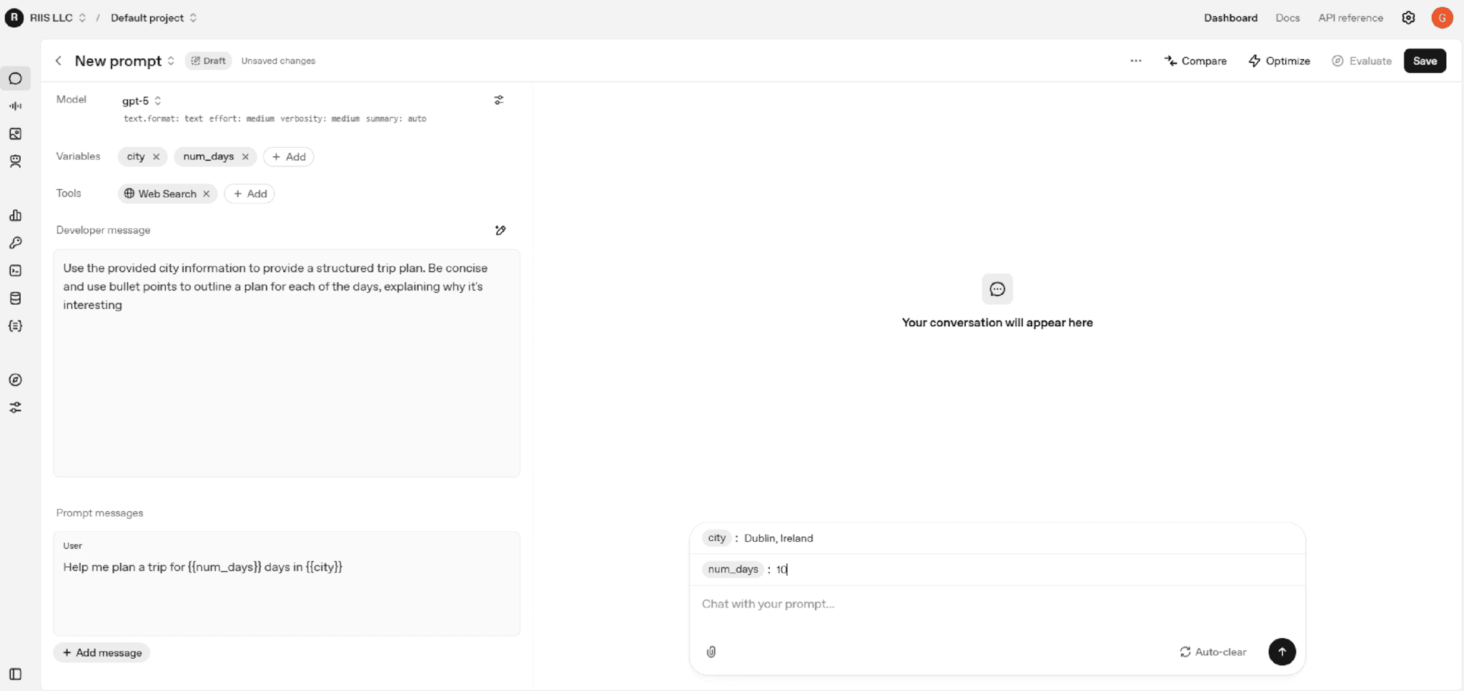Let’s give our Trip Planner a spin. We ware going to set our city to Dublin and the number of days to 5 in the variables section above the chat interface on the bottom right.