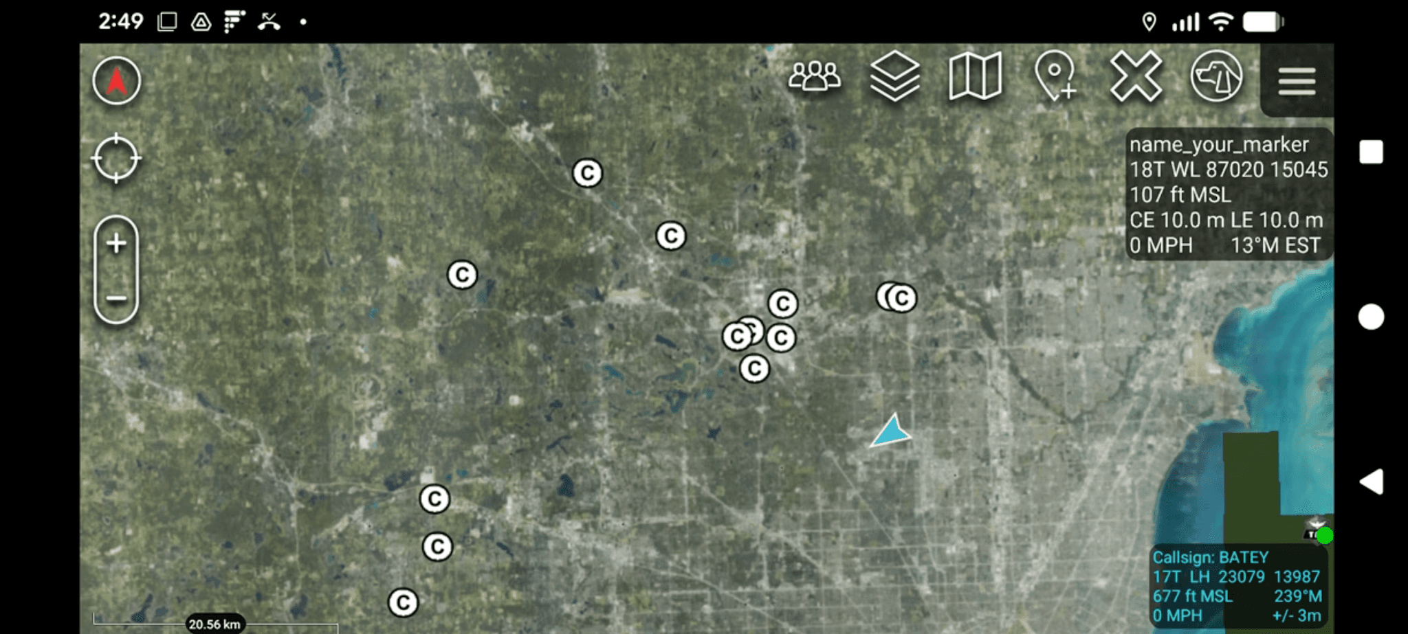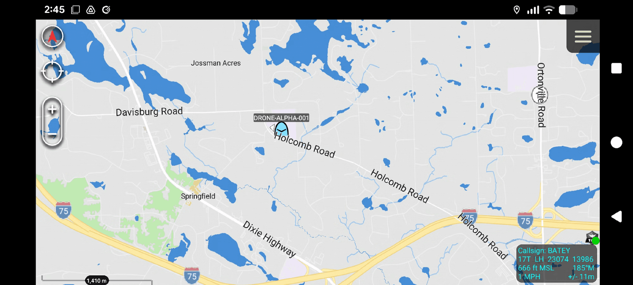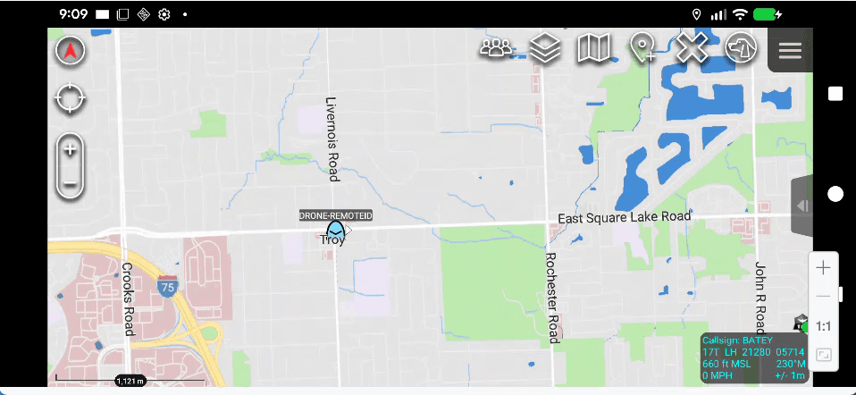 Click Deploy in the top-right corner of the editor to activate the flow. Then click the button on the left side of the Inject node to trigger it manually. If the TAK Server node shows a connected status, the CoT event is transmitted and the drone marker appears on the ATAK map, labeled with the uas_id and positioned at the coordinates from the payload. And if all goes well: