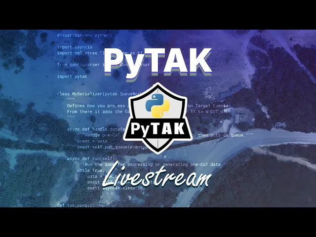 And now for the reason you all came here! PyTak is a Python library that handles the asyncio plumbing for publishing CoT events to a TAK server. Rather than managing raw sockets and XML serialization yourself, PyTak gives you a QueueWorker base class and a CLITool runner that takes care of the connection lifecycle, TLS negotiation, and message dispatch.